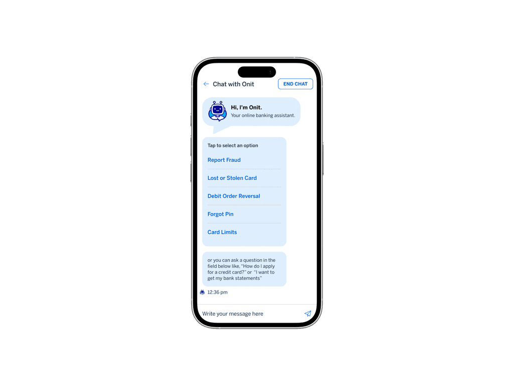 Basic FAQs, complex responses with options, in-chat transaction reversals, account opening journeys, deep-app integrations, chatbot error flows—I designed every interaction, visual element, and component from the ground up.